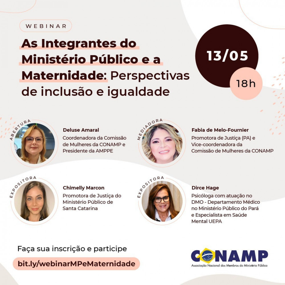 No dia 13 de maio, às 18h, ocorrerá o webinar “As Integrantes do Ministério Público e a Maternidade: Perspectivas de inclusão e igualdade”, promovido pela comissão de mulheres da CONAMP. O evento será on-line e sem necessidade de inscrição prévia.