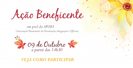 A APMP e a Associação Paranaense de Orientação, Integração e Ofícios (APOIO) realizam, no dia 09 de outubro, uma Ação Beneficente. Há duas maneiras de participar: adquirir um ingresso para o Café Colonial ou doar o valor do ingresso. Todo o montante arrecadado será revertido à APOIO.