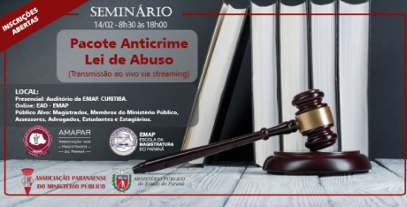 A Associação Paranaense do Ministério Público (APMP), a Escola da Magistratura do Paraná (EMAP), a Associação dos Magistrados do Paraná (AMAPAR) e a Escola Superior do Ministério Público (MPPR) promovem o Seminário “Pacote Anticrime Lei de Abuso”. O evento, exclusivo para Promotores e Procuradores de Justiça, Magistrados, Assessores, Advogados, Estudantes e Estagiários, ocorrerá no dia 14 de fevereiro de 2020, no auditório da EMAP, em Curitiba/PR.