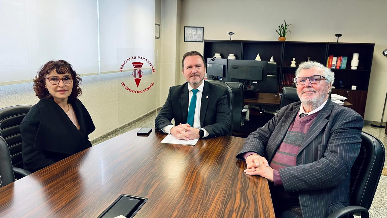 O Presidente da Associação Paranaense do Ministério Público (APMP), Fernando da Silva Mattos, esteve reunido, na manhã desta segunda-feira (1º), com a 2ª Vice-Presidente e Diretora de Aposentados, Elhanei Librelotto, e com o Assessor Especial da Presidência, Wanderlei Carvalho da Silva, para tratar de pautas relacionadas aos direitos dos associados aposentados.