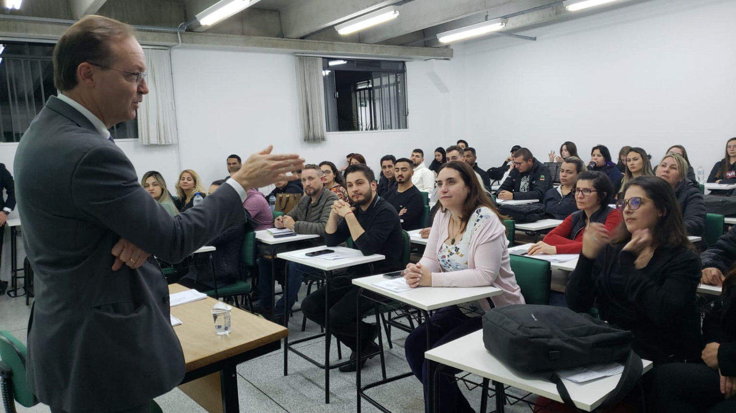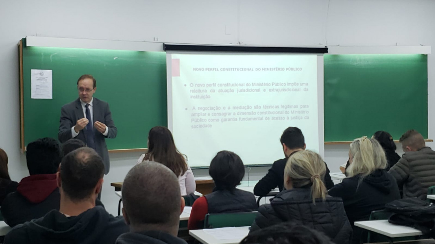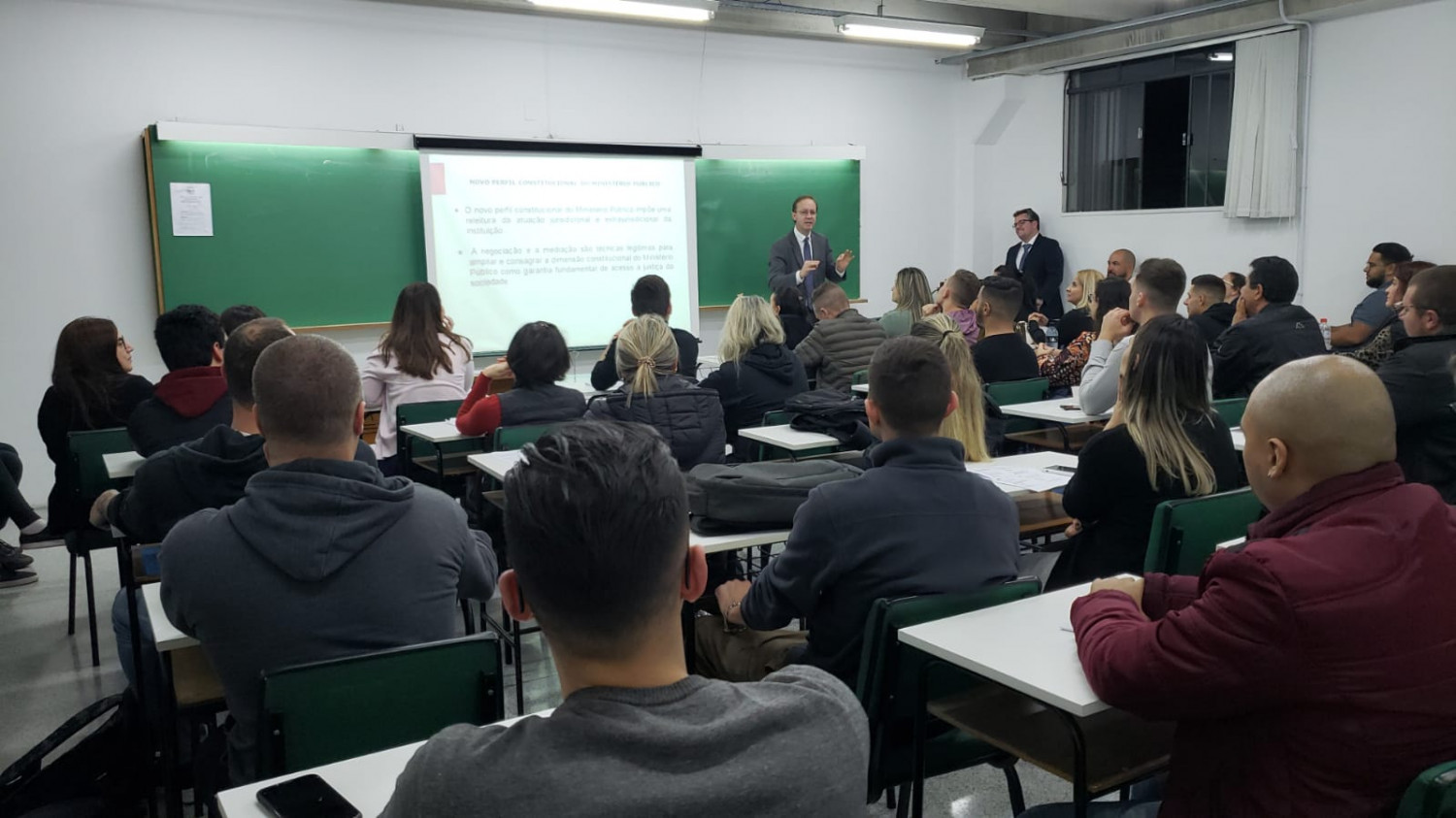 A convite da coordenação do curso de Direito da Universidade Tuiuti do Paraná (UTP), na noite desta quinta-feira (13/10), o associado Régis Rogério Vicente Sartori, promotor de Justiça com atuação no Núcleo de Atendimento ao Cidadão e Comunidades do MPPR, palestrou na Semana Acadêmica de Direito da UTP, representando a APMP.