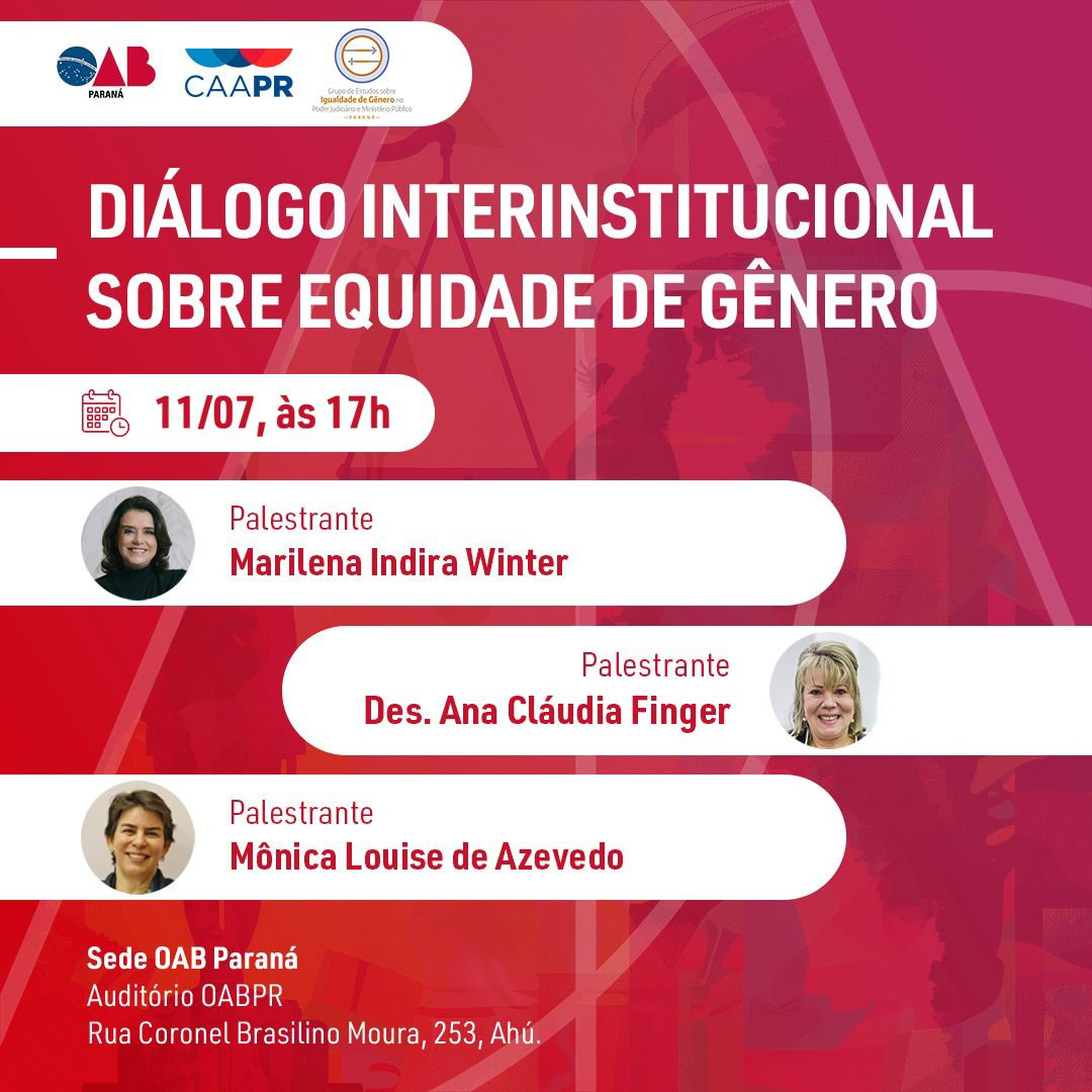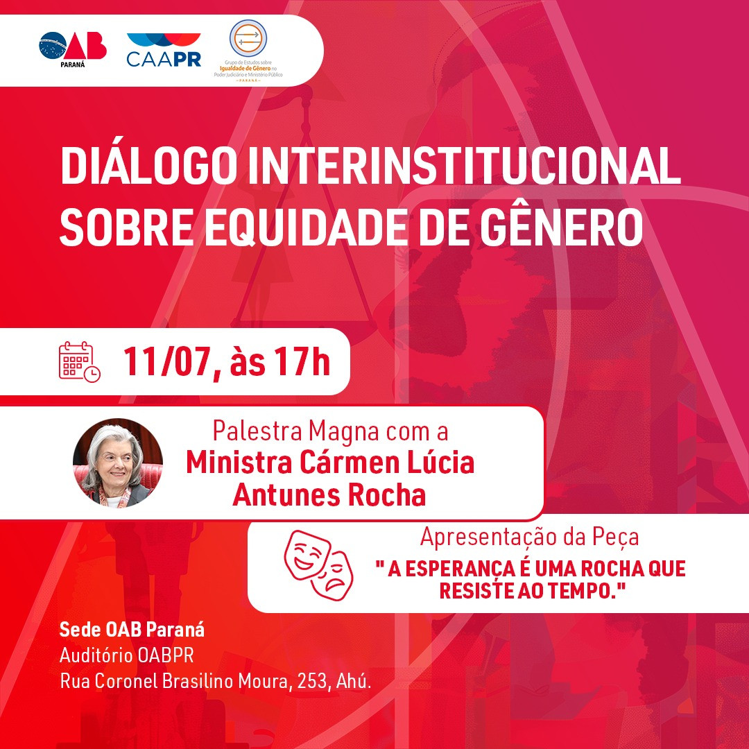 Na próxima quinta-feira (11), a APMP vai participar do Diálogo Interinstitucional sobre Equidade de Gênero, na sede da Ordem dos Advogados do Brasil (OAB) Paraná, em Curitiba. O evento é uma parceria entre a OAB-PR e o Grupo de Estudos sobre Igualdade de Gênero do Ministério Público e do Poder Judiciário e contará com palestra magna da Ministra Cármen Lúcia, do STF. A procuradora de Justiça e associada, Mônica Louise de Azevedo, também será uma das palestrantes.