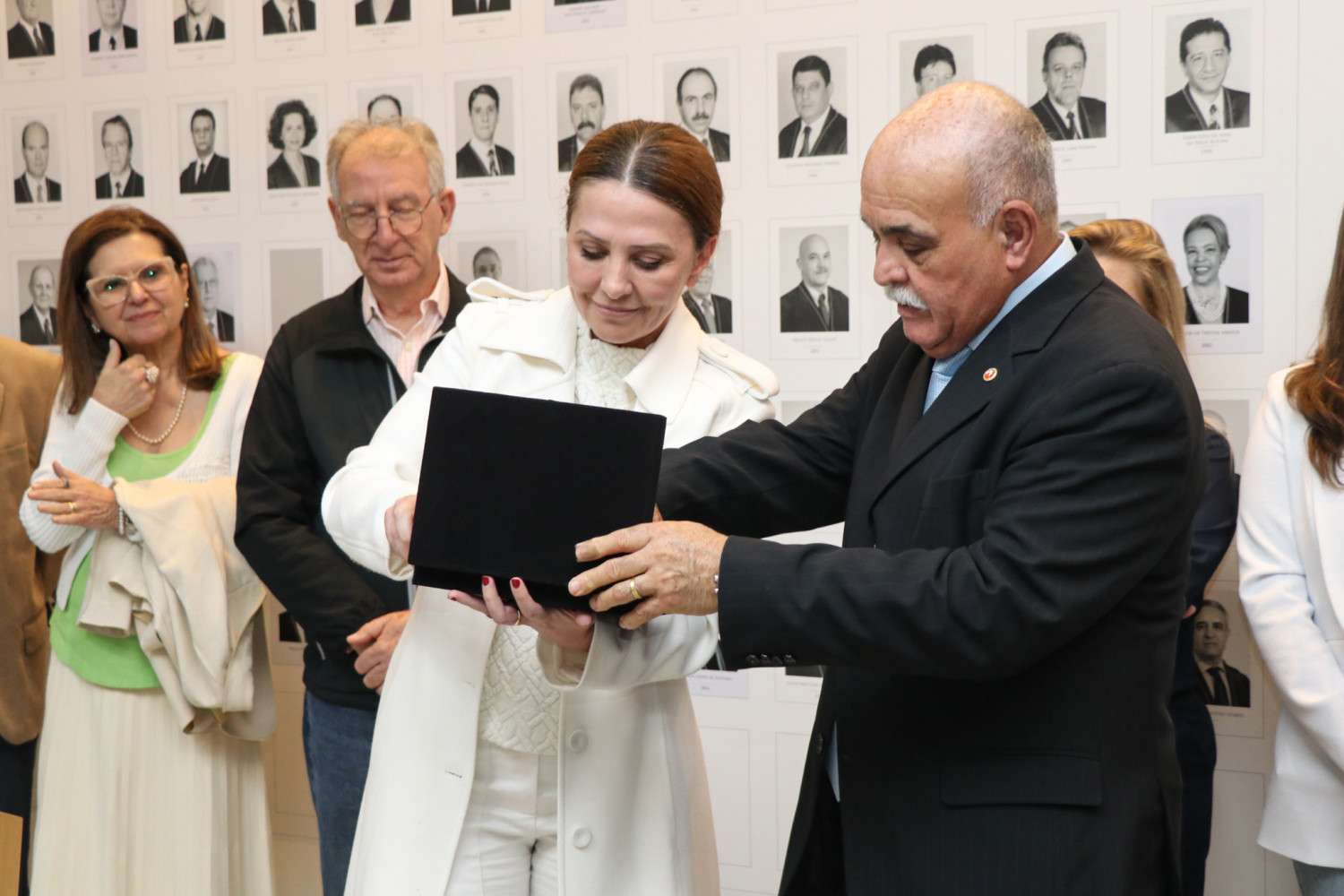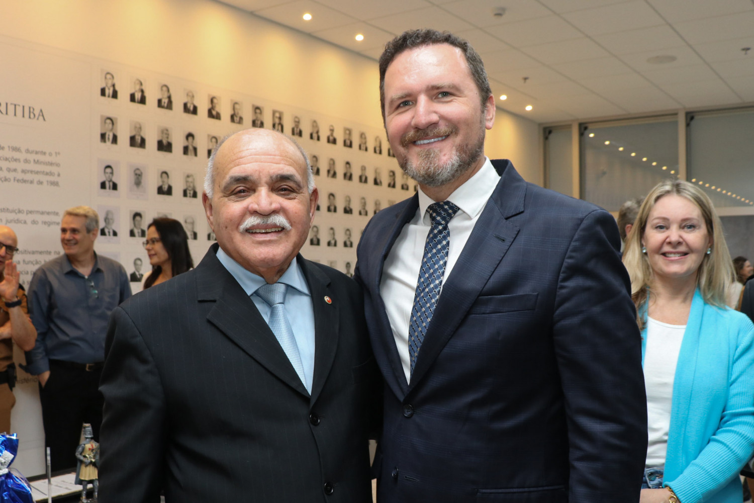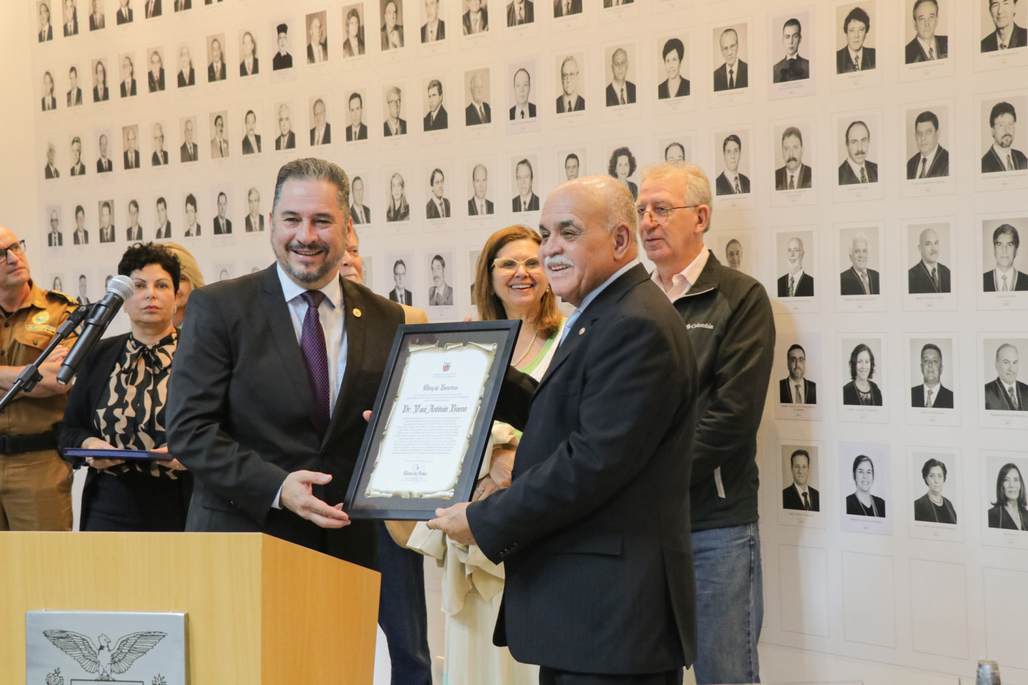 Durante a solenidade, o associado também foi homenageado pelo MPPR e pela Polícia Militar. Das mãos do deputado Gilson de Souza recebeu uma menção honrosa da Assembleia Legislativa do Paraná, em agradecimento pelos 56 anos de atuação no serviço público.