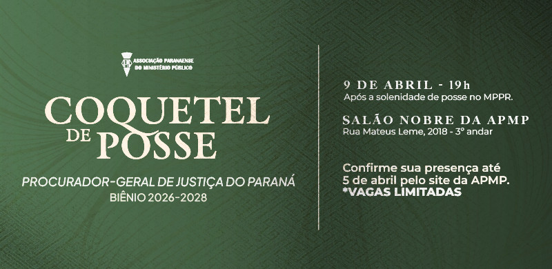 A Associação Paranaense do Ministério Público (APMP) realizará, no dia 9 de abril, às 19h, no Salão Nobre de sua sede, o coquetel de posse do Procurador-Geral de Justiça, Francisco Zanicotti, reconduzido ao cargo para o biênio 2026/2028.