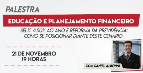A APMP, por meio da Diretoria de Eventos Culturais, promoverá a palestra “Educação e Planejamento Financeiro - Selic 4,50% ao ano e reforma da previdência: como se posicionar diante deste cenário” com o economista Daniel Alberini. O evento, para associados (as), dependentes e convidados (as), ocorrerá no dia 21 de novembro, no Salão Nobre da sede administrativa, em Curitiba, a partir das 19h.