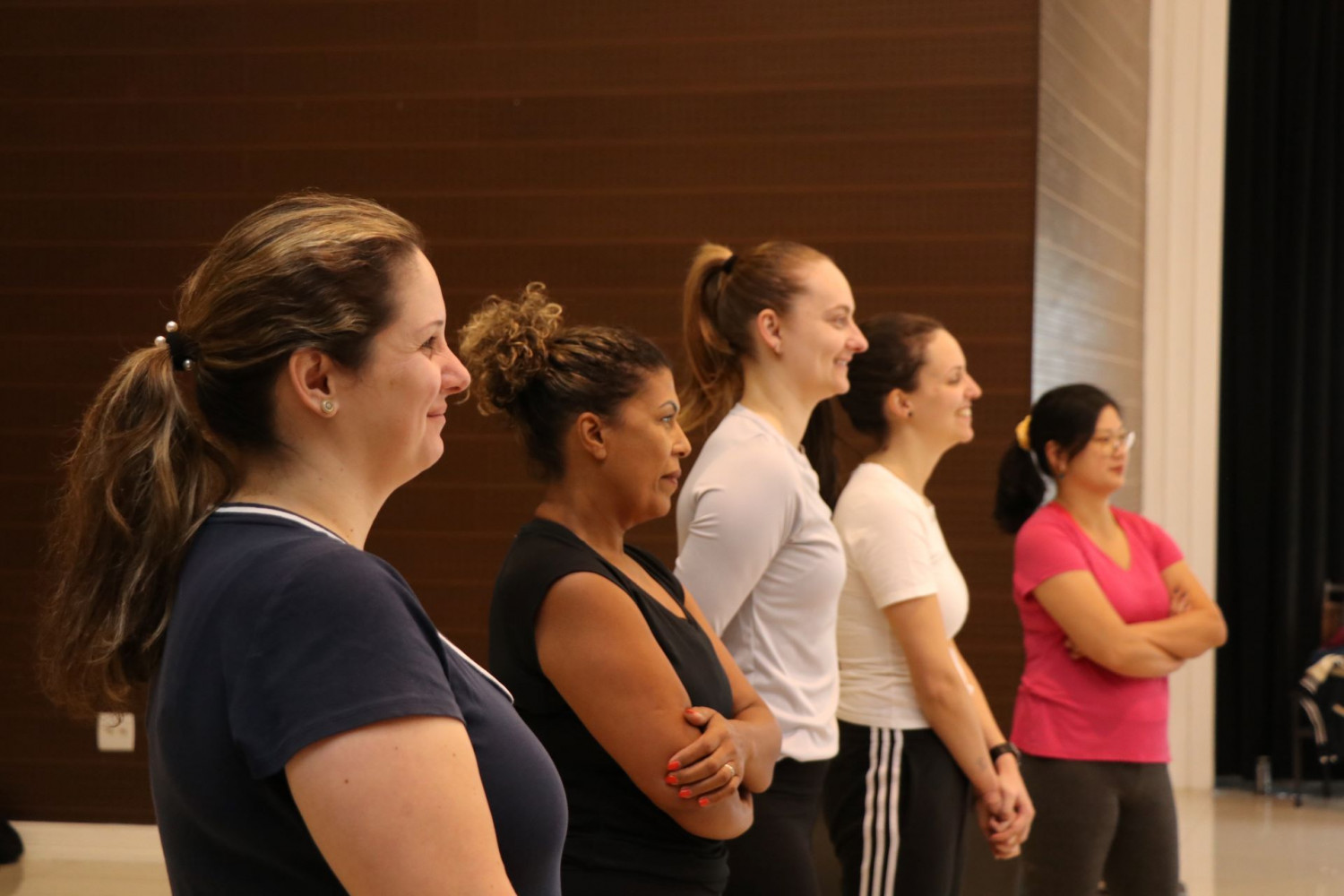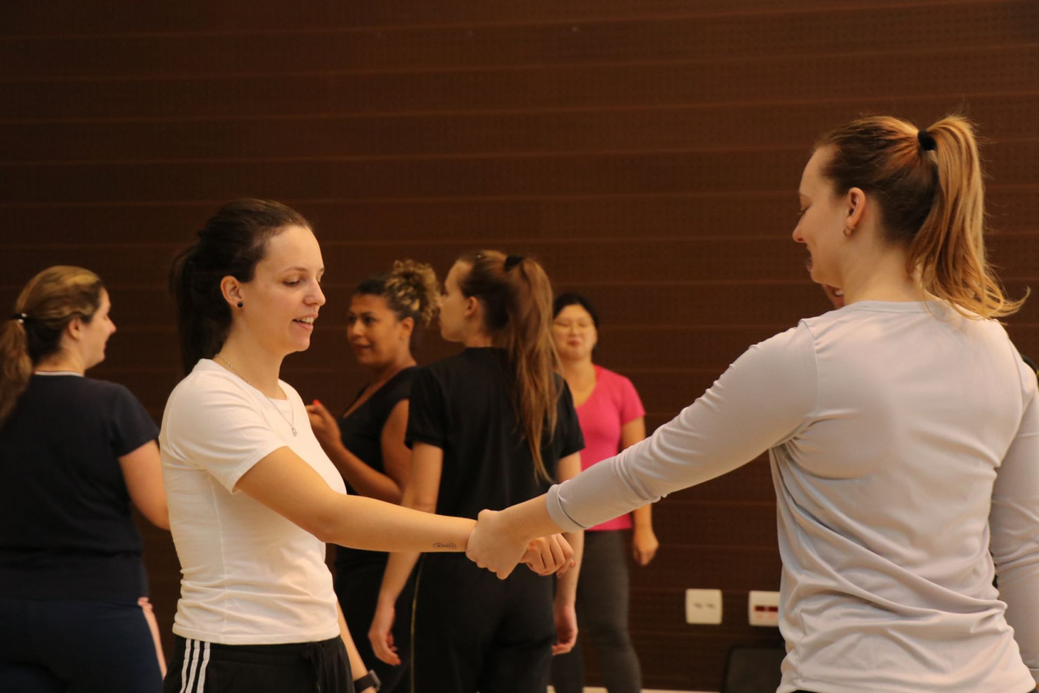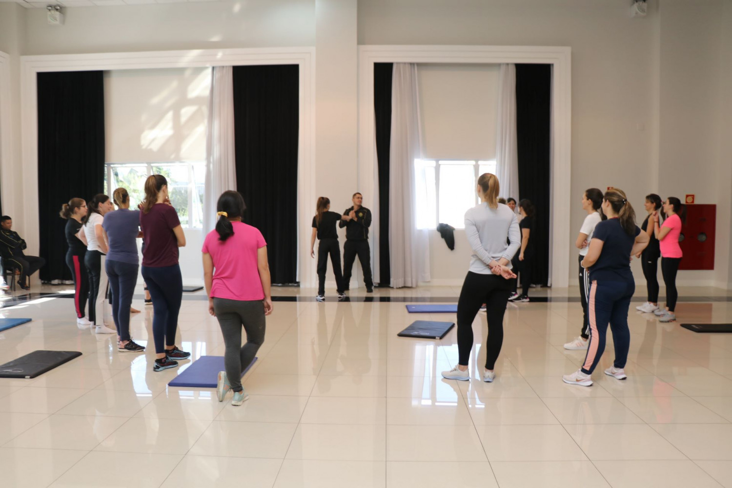 O instrutor Tenente Cochek deu boas-vindas às alunas e apresentando a dinâmica da aula. Após um breve aquecimento, Cochek e a Tenente Jéssica abordaram fundamentos de deslocamento, guarda, defesa no solo (levantada técnica), esgrima e técnica de asfixia (mata-leão), entre outros.