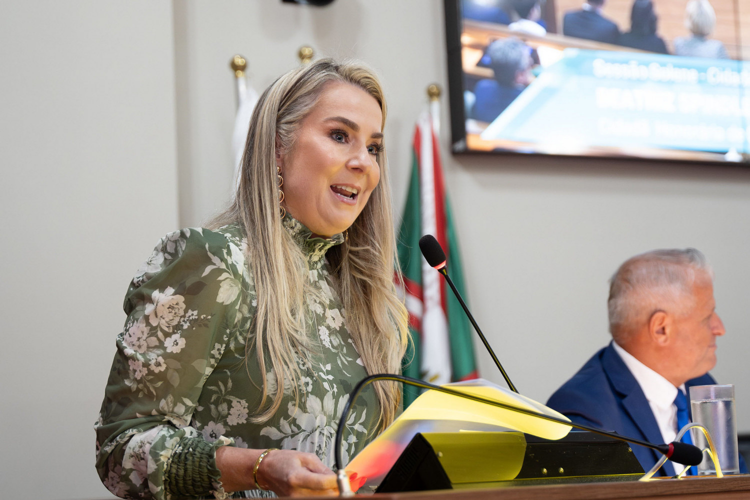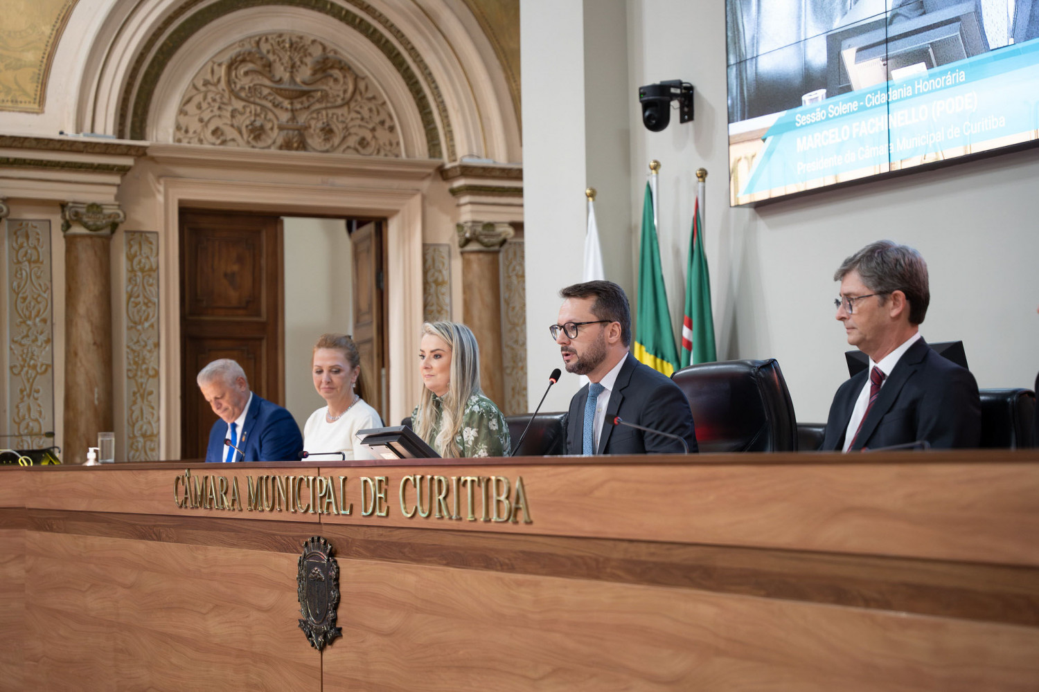 A presidente da APMP, Symara Motter, compôs a mesa de honra do evento ao lado da associada homenageada e das seguintes autoridades: Marcelo Fachinello, Presidente da CMC; Márcio Teixeira dos Santos, Procurador de Justiça e coordenador do Centro de Apoio Operacional das Promotorias da Criança e do Adolescente e da Educação do Ministério Público do Paraná, representando o Procurador-geral de Justiça, Francisco Zanicotti; ex-Procurador-Geral de Justiça, Gilberto Giacoia; Sidinei Toaldo, Vereador e proponente da homenagem; e Eduardo de Oliveira Leite, advogado especializado em Direito Civil e pai da homenageada.