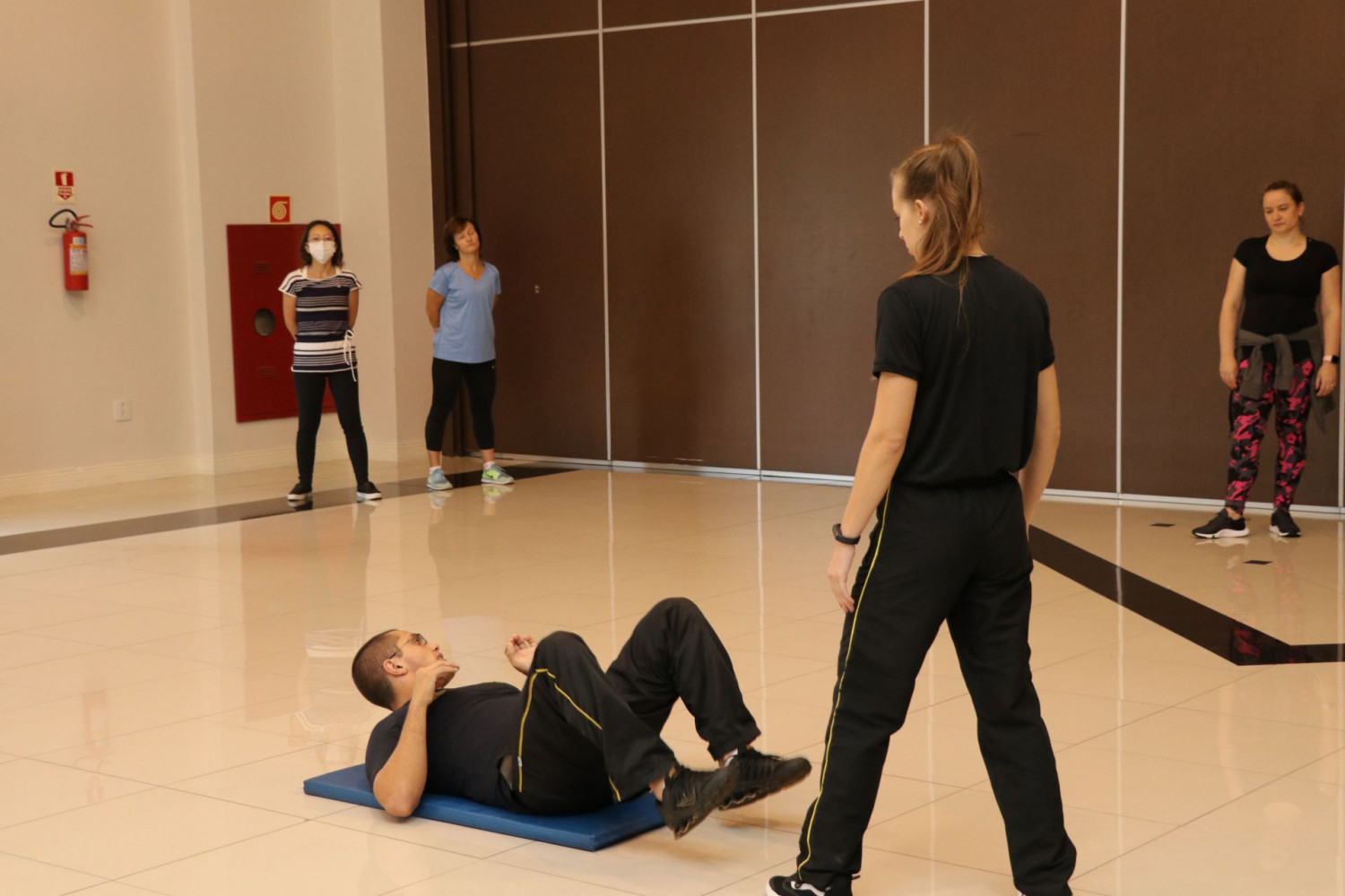 Na sequência, o instrutor, Tenente Cochek, apresentou a dinâmica da aula e realizou um breve aquecimento com as participantes. Com a colaboração da Tenente Jéssica, Cochek ensinou fundamentos de deslocamento, guarda, defesa no solo (levantada técnica), esgrima e técnica de asfixia (mata-leão). As associadas também aprenderam com o instrutor técnicas de desvencilhamento de puxões pelo braço, pescoço e cabelo.