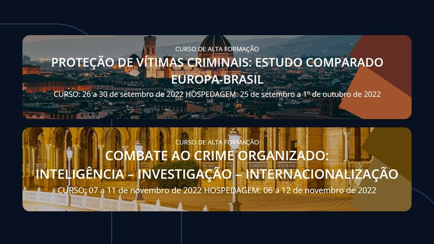 Já o curso "Combate ao Crime Organizado: Inteligência – Investigação – Internacionalização" ocorrerá de 7 a 11 de novembro de 2022 em Sevilha, na Espanha. Também são 25 horas-aula, com a tradução das palestras para o português. Nas visitas institucionais haverá tradução consecutiva para o português. Clique aqui e saiba mais.