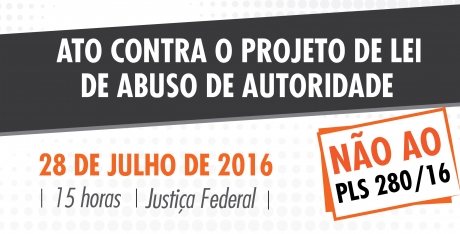 A Associação dos Juízes Federais do Brasil (AJUFE), a Associação Paranaense dos Juízes Federais (APAJUFE), a Associação Paranaense do Ministério Público (APMP) e a Associação dos Magistrados do Paraná (AMAPAR) convidam a todos para a mobilização contra o projeto de lei de abuso de autoridade. O ato público ocorrerá no dia 28 de julho de 2016, às 15 horas, na sede da Justiça Federal, localizada na Avenida Anita Garibaldi, 888, no bairro Ahú, em Curitiba.