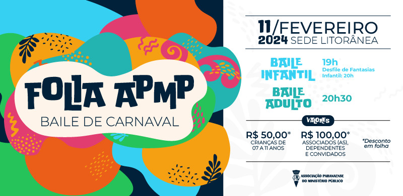 Coloque na agenda e prepare-se para a folia. No dia 11 de fevereiro, a APMP realizará, na sede de Matinhos, o tradicional Baile de Carnaval. O evento, que neste ano ganhou o nome “Folia APMP”, promete animar associados, associadas, dependentes e convidados. Todos estão convidados a irem fantasiados ou com seus abadás.