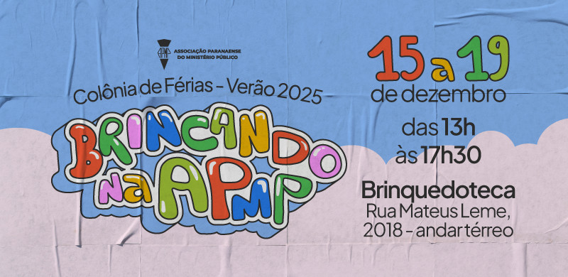 A Associação Paranaense do Ministério Público (APMP) promove, entre os dias 15 e 19 de dezembro, a edição de verão do Brincando na APMP, iniciativa dedicada exclusivamente a crianças de 4 a 12 anos. As atividades serão realizadas da sede administrativa da Associação, das 13h às 17h30, com ponto de encontro na Brinquedoteca