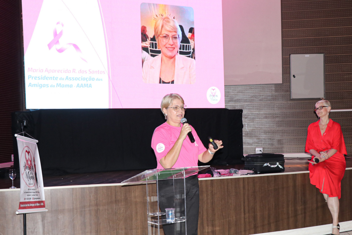 Posteriormente, ocorreu também uma palestra da presidente da Associação das Amigas da Mama (AAMA), Maria Aparecida Santos. A AAMA é uma entidade civil de assistência social, de caráter filantrópico e sem fins econômicos. Por meio de voluntariado, as associadas da AAMA revertem a experiência que tiveram em prol de outras mulheres que precisam de apoio para enfrentar a doença.