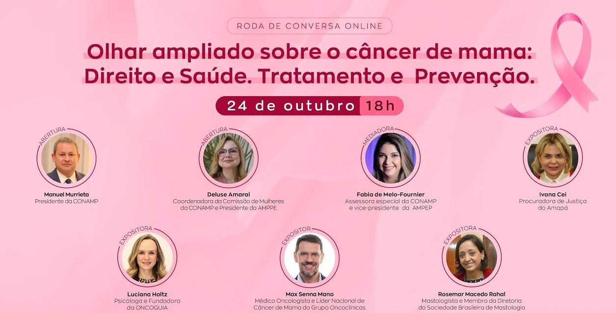 Nesta terça-feira (24), a Associação Nacional dos Membros do Ministério Público (CONAMP) realizará uma roda de conversa on-line, com o tema “Olhar ampliado sobre o câncer de mama: Direito e Saúde. Tratamento e Prevenção”. O evento faz parte das ações voltadas para o Outubro Rosa e terá início às 18h.