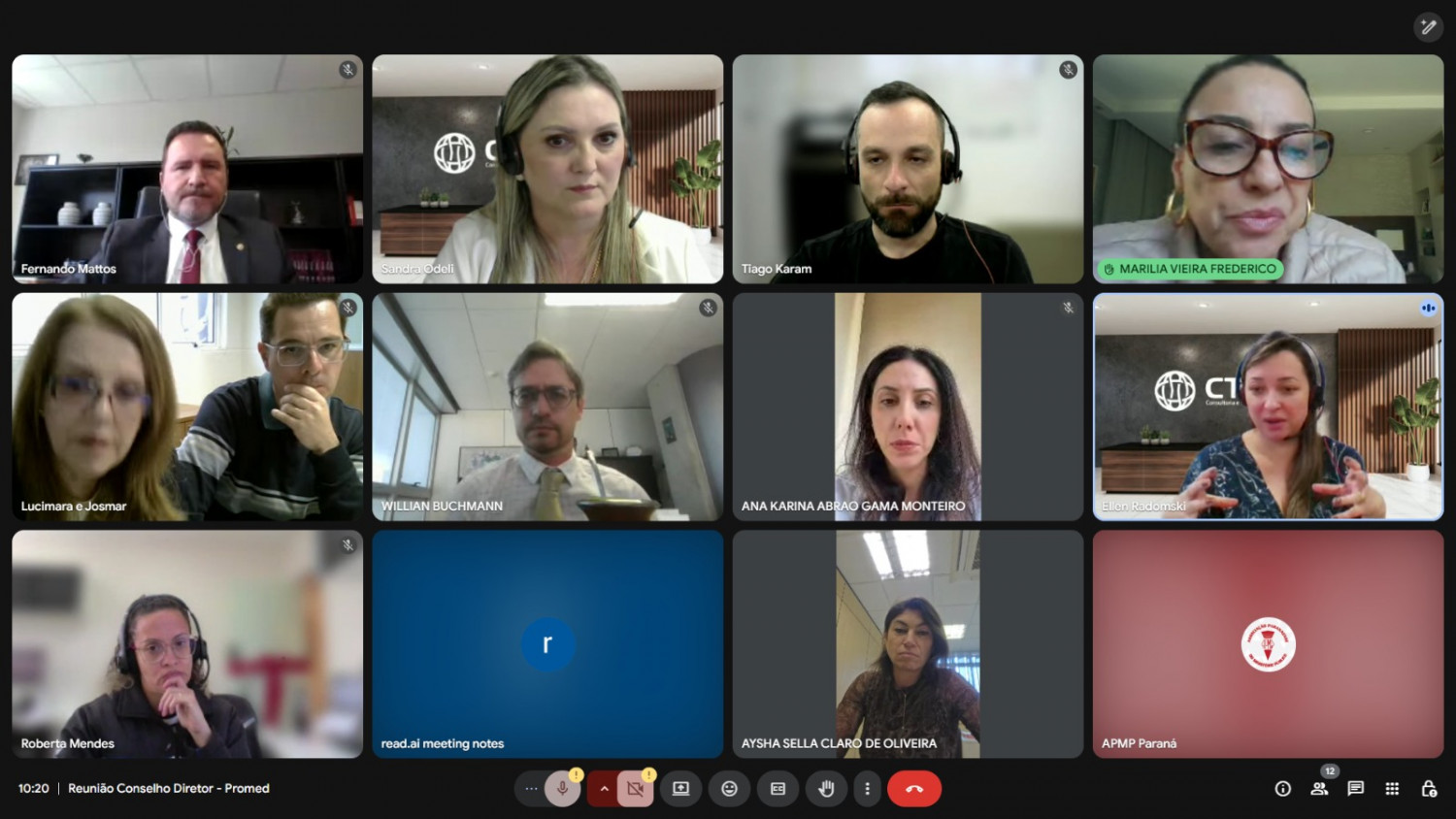 Estiveram presentes o Presidente da APMP e da PROMED, Fernando da Silva Mattos; o Diretor Executivo, Willian Buchmann; a Diretora de Planejamento, Ana Karina Abrão Monteiro; a Diretora de Relações Públicas, Aysha Sella Claro de Oliveira; a Diretora Suplente, Marilia Vieira Frederico; a Superintendente, Lucimara Hipólito; e o colaborador da PROMED, Josmar Thá Rebello. Representando a consultoria, participaram Sandra Odeli, Thiago Karam, Ellem Radomski e Roberta Mendes (contadora).