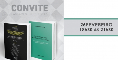 Na próxima sexta-feira, 26 de fevereiro, das 18h30 às 21h30, será realizado o lançamento dos livros “Aspectos controvertidos da Lei de Improbidade Administrativa: Uma análise crítica a partir dos julgados dos tribunais superiores”, editora Del Rey, e “Aplicação direta dos princípios constitucionais – Controle de Constitucionalidade das Decisões Judiciais”, editora safE. O evento acontecerá na Livraria da Vila, no Shopping Pátio Batel, em Curitiba.
