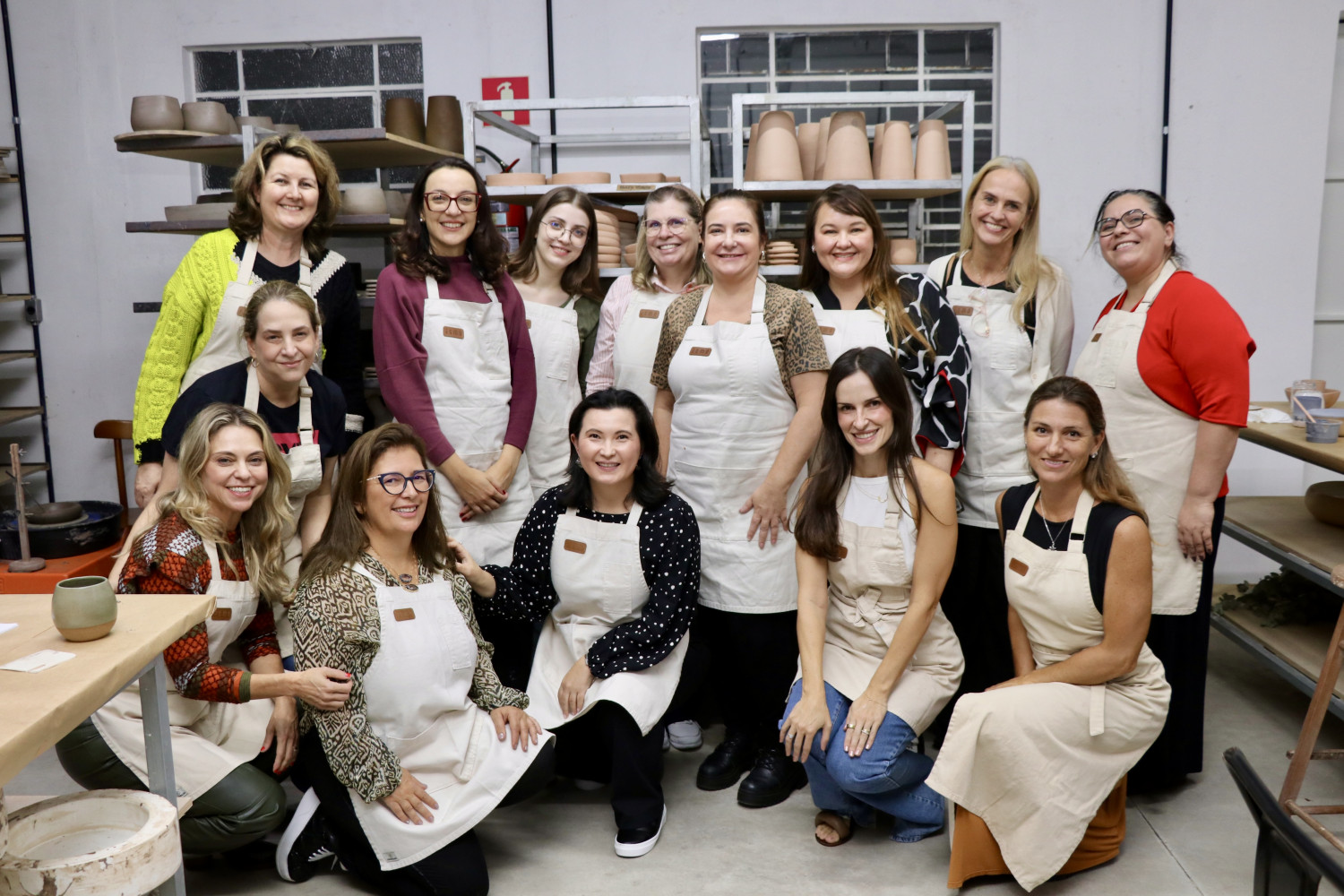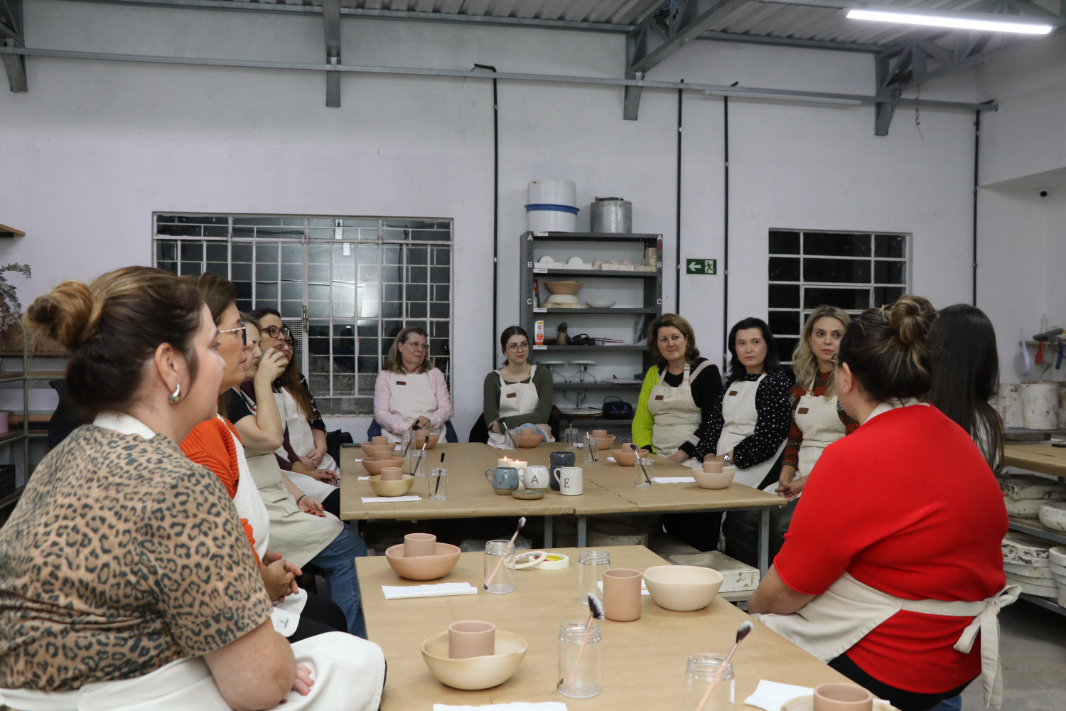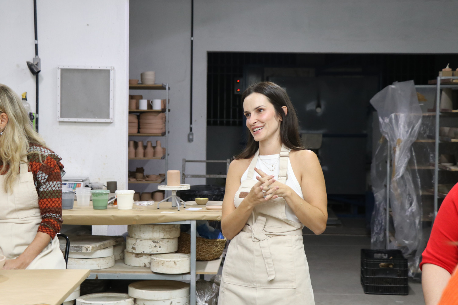 Com orientação da ceramista Bruna Vuelma, criadora da marca Esmo, e sua equipe, as participantes tiveram a oportunidade de explorar a técnica da esmaltação em um ambiente acolhedor e inspirador. Durante as três horas de curso, cada uma pôde personalizar suas próprias peças e vivenciar um momento de pausa na rotina, estimulado pela arte e pela criatividade.