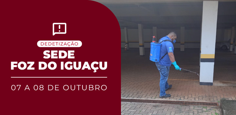 A Associação Paranaense do Ministério Público (APMP) informa que nos dias 07 e 08 de outubro a sede de Foz do Iguaçu (PR) estará fechada para a dedetização total do local e limpeza das caixas-d’água. O serviço é executado pela empresa Desentupidora e Dedetizadora Sucesso.