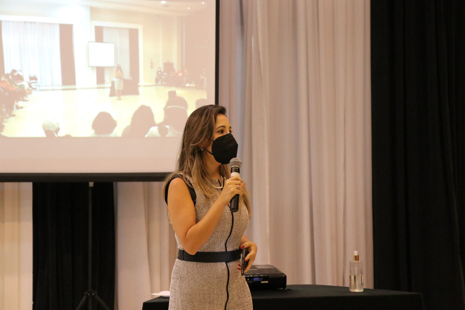 A promotora de Justiça Mariana Dias Mariano, da Diretoria de Mulheres da APMP, mediou o evento que abriu a agenda de comemoração do Dia Internacional da Mulher.
