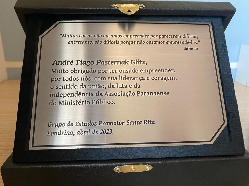 “Recebi com muita honra a homenagem do Grupo de Estudos Promotor Santa Rita. O GE de Londrina é um grupo vanguardista e muito atuante, se destacando sempre no nosso estado, composto por promotores e promotoras muito preparados tecnicamente, que buscam incessantemente a construção de uma sociedade melhor e mais justa. A homenagem me tocou por demais e agradeço a cada um deles”, destacou o 1º vice-presidente da APMP.