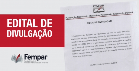 A Fundação Escola do Ministério Público do Estado do Paraná (Fempar) divulgou, no dia 30 de novembro, o resultado da eleição dos membros aposentados para representar o Conselho de Curadores (gestão 2019/2020).