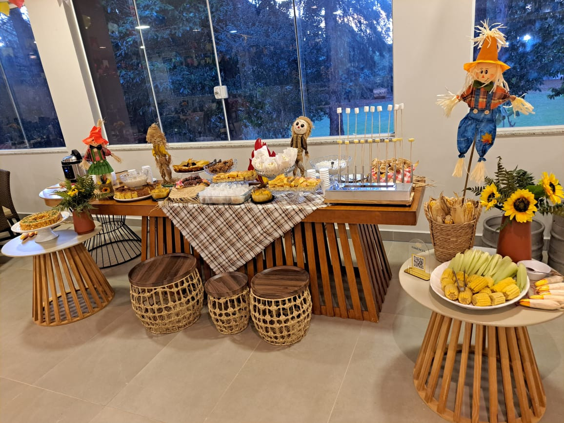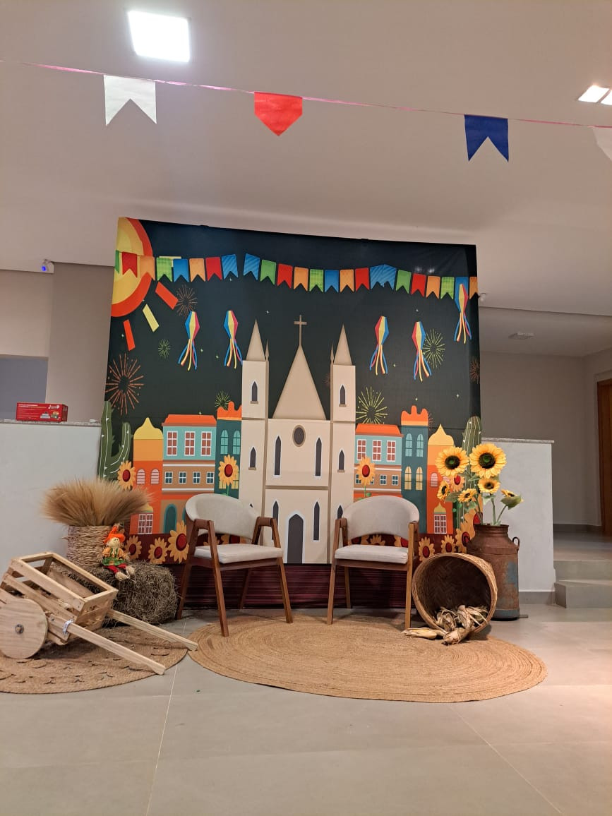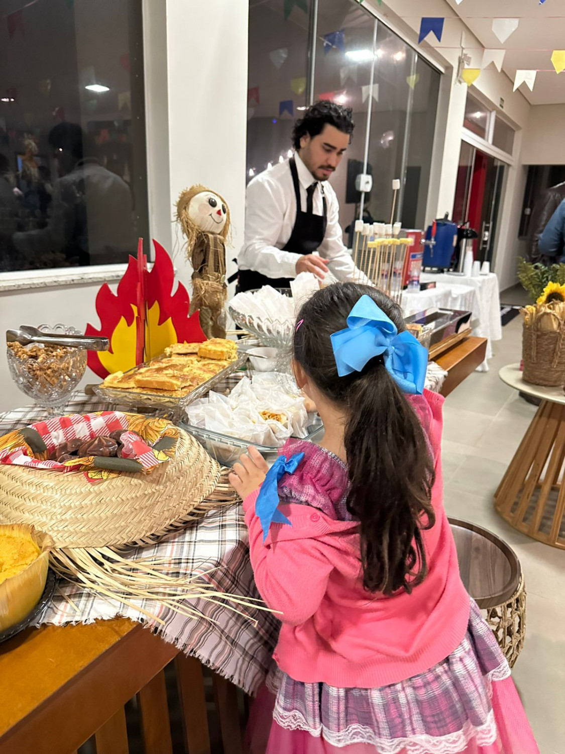 Com decoração especial, incluindo móveis, painéis, toalhas e bandeirinhas coloridas, o espaço foi cuidadosamente preparado para proporcionar uma experiência genuinamente junina.