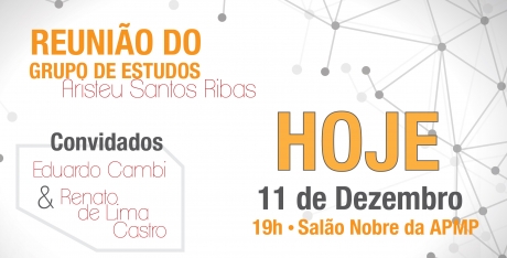 O Grupo de Estudos de Curitiba, Aristeu Santos Ribas, realizará hoje, 11 de dezembro, a partir das 19h, uma reunião no salão nobre da APMP. A pauta do grupo abordará a análise dos projetos de lei de ação civil pública, em tramitação na Câmara dos Deputados.