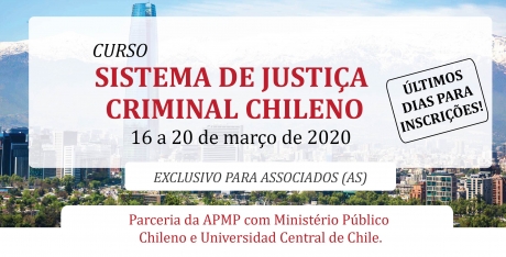 A APMP informa que as inscrições para o curso internacional "Sistema de Justiça Criminal Chileno" estão se encerrando. Os interessados podem realizar a inscrição até o dia 31 de janeiro de 2020.