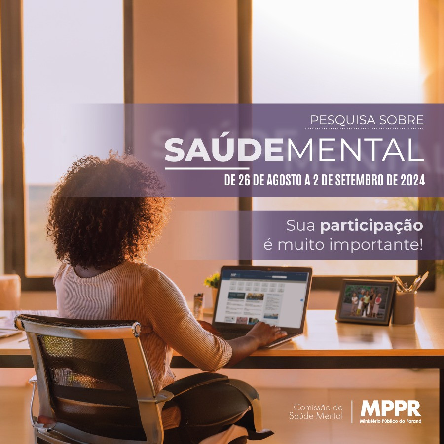 Com o objetivo de implementar ações efetivas para a promoção da saúde mental de seus integrantes, o Ministério Público do Paraná, por meio da Comissão de Prevenção a Situações de Risco à Saúde Mental, convida todos os integrantes da instituição a participarem de uma pesquisa anônima que visa diagnosticar os fatores que afetam o bem-estar das pessoas no ambiente institucional. A partir das respostas, a Procuradoria-Geral de Justiça desenvolverá iniciativas imediatas para atender às demandas apontadas.