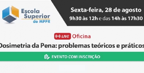 Nesta sexta-feira, dia 28 de agosto, das 9h30 às 12h e das 14h às 17h30, ocorrerá a oficina on-line “Dosimetria da Pena: problemas teóricos e práticos”. Com apoio da APMP, o evento tem realização em parceria com a Escola Superior do Ministério Público do Paraná (ESMP), a Fundação Escola do Ministério Público do Paraná (FEMPAR), a Associação dos Juízes Federais (AJUFE), a Associação Paranaense dos Juízes Federais (APAJUFE), a Escola da Magistratura do Paraná (EMAP), a Escola Superior de Advocacia (ESA) da OAB Paraná e a Escola da Magistratura Federal do Paraná (ESMAFE-PR).