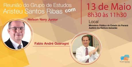 O Grupo de Estudos Aristeu Santos Ribas, de Curitiba, por meio da Associação Paranaense do Ministério Público, com apoio da Procuradoria-Geral de Justiça, do CEAF e da FEMPAR, realizará para os membros do MP e seus assessores um evento, durante a reunião ordinária do grupo de estudos, com as presenças dos juristas Nelson Nery Junior e Fábio André Guaragni.