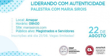 Na próxima quinta-feira, dia 22 de agosto, ocorrerá a palestra “Liderando com autenticidade”, que será ministrada pela presença internacional de Maria Sirois, especialista em Psicologia Positiva. O evento é uma realização conjunta da Escola da Magistratura do Paraná (Emap) e da Associação dos Magistrados do Paraná (Amapar), e ocorrerá no auditório da Amapar.