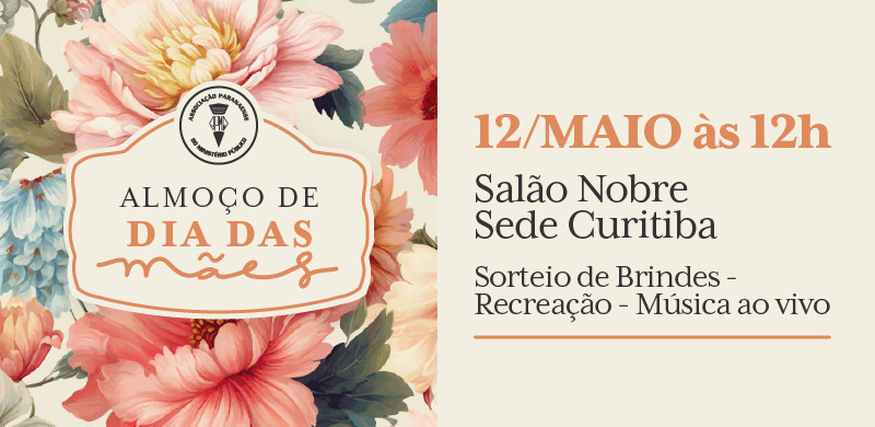 No dia 12 de maio, a APMP realizará o tradicional Almoço de Dia das Mães. O evento, que ocorrerá no Salão Nobre da sede de Curitiba, é destinado a associados, associadas, familiares e convidados.