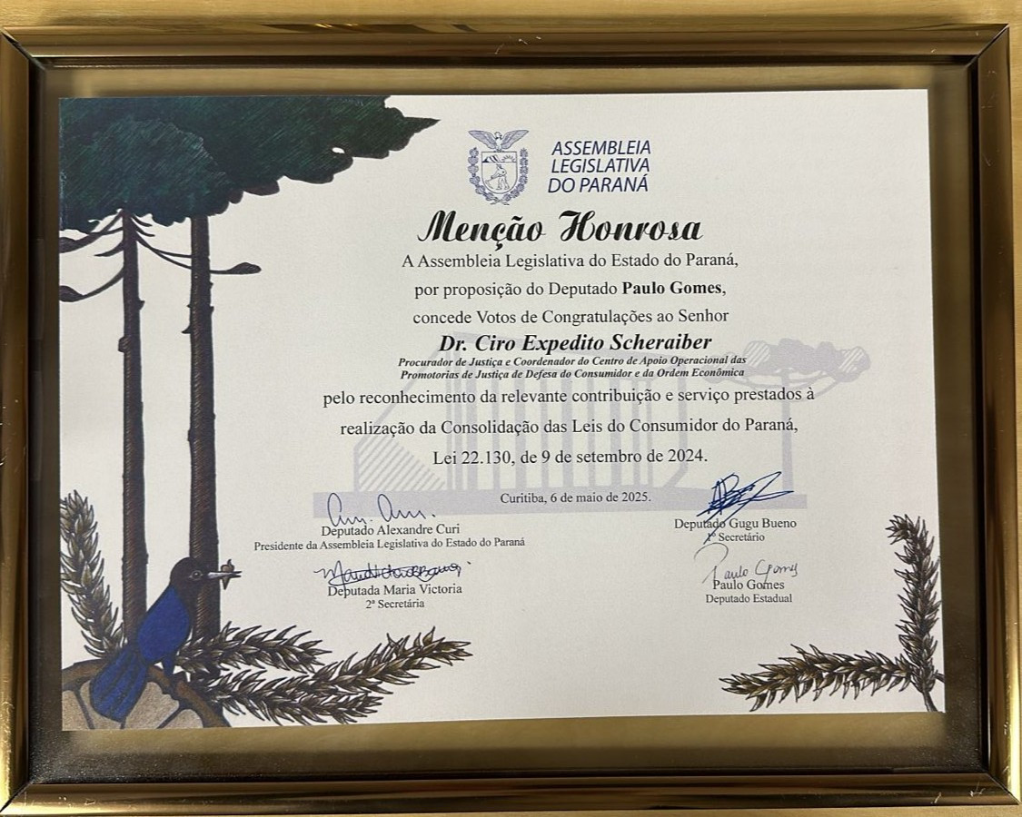 Durante sessão plenária realizada na última terça-feira (6), a Assembleia Legislativa do Paraná prestou homenagem ao Procurador de Justiça Ciro Expedito Scheraiber, em reconhecimento à sua expressiva contribuição no processo de criação do novo Código do Consumidor Paranaense.