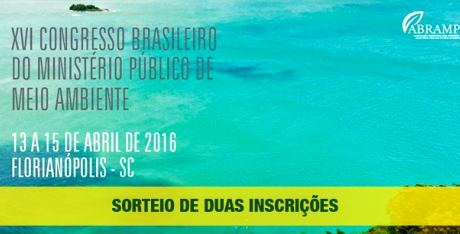 A Associação Brasileira dos Membros do Ministério Público de Meio Ambiente - ABRAMPA, por meio da Associação Paranaense do Ministério Público - APMP e da Rede Ambiental das Bacias Hidrográficas - MPPR, irá sortear duas inscrições cortesia para o XVI Congresso Brasileiro do Ministério Público de Meio Ambiente, que ocorrerá dos dias 13 a 15 de abril, em Florianópolis - SC.