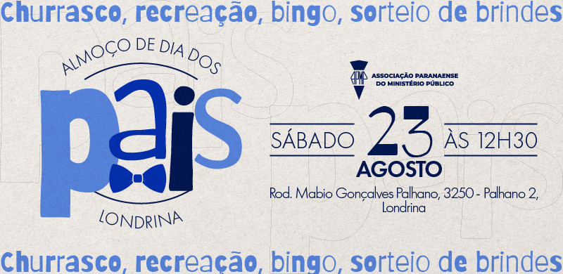 Em parceria com a APMP, o Grupo de Estudos Promotor Santa Rita realizará uma comemoração especial pelo Dia dos Pais, na subsede de Londrina, no dia 23 de agosto (sábado). A programação começa às 12h30 e contará com churrasco de almoço, recreação infantil, bingo e sorteio de brindes.