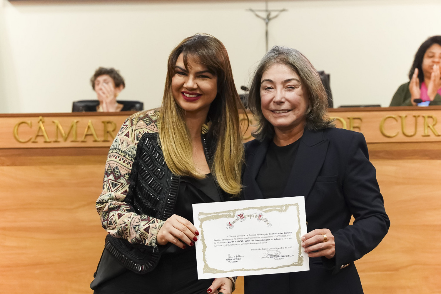 Ticiane Pereira recebeu os votos de congratulações e aplausos da vereadora, procuradora da mulher no legislativo curitibano e criadora do prêmio, Maria Letícia.