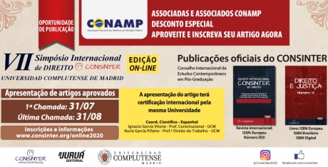O Conselho Internacional de Estudos Contemporâneos em Pós-Graduação (CONSINTER) promoverá o VII Simpósio Internacional de Direito CONSINTER 2020 - Edição on-line - Universidad Complutense de Madrid em outubro de 2020*. O evento contará com a apresentação oral dos artigos aprovados pelo Conselho do CONSINTER nos Grupos de Trabalho on-line, com certificação internacional emitida pela mesma Universidade.